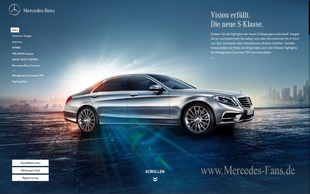 Jetzt funkt's: Mit der neuen Mercedes S-Klasse (W222) ist ein neuer Star geboren. Das soll jeder erfahren. Das darf ruhig jeder wissen. Und also trägt Mercedes-Benz die frohe Kunde, von seinem neuen Flaggschiff in die Welt hinaus. Damit die Botschaft überall ankommt, wird auf allen wichtigen Kommunikationskanälen gesendet. Unter dem Motto „Die neue S-Klasse. Vision erfüllt.“ präsentiert sich die Limousine als weltweiter Maßstab für luxuriöses Fahren. Damit wird selbstbewusst und souverän auf den Punkt gebracht, wofür die S-Klasse als Ikone der Fortbewegung steht: Vorne ist nur, wer weiterdenkt und Neues wagt. Im Mittelpunkt der weltweiten...,