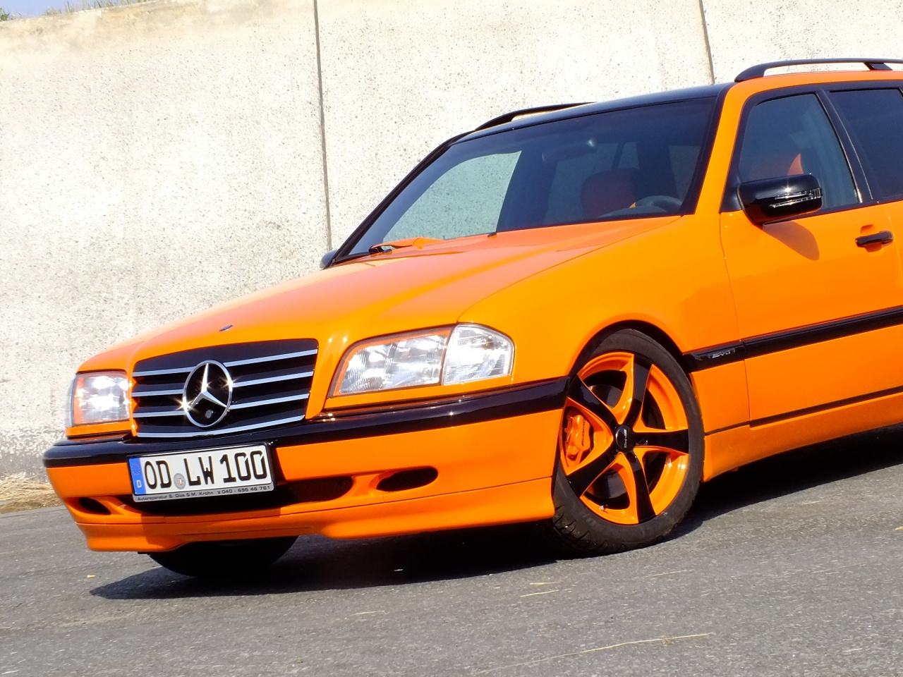 Orangefarbener Mercedes C180 bietet dem grauen Alltag Paroli