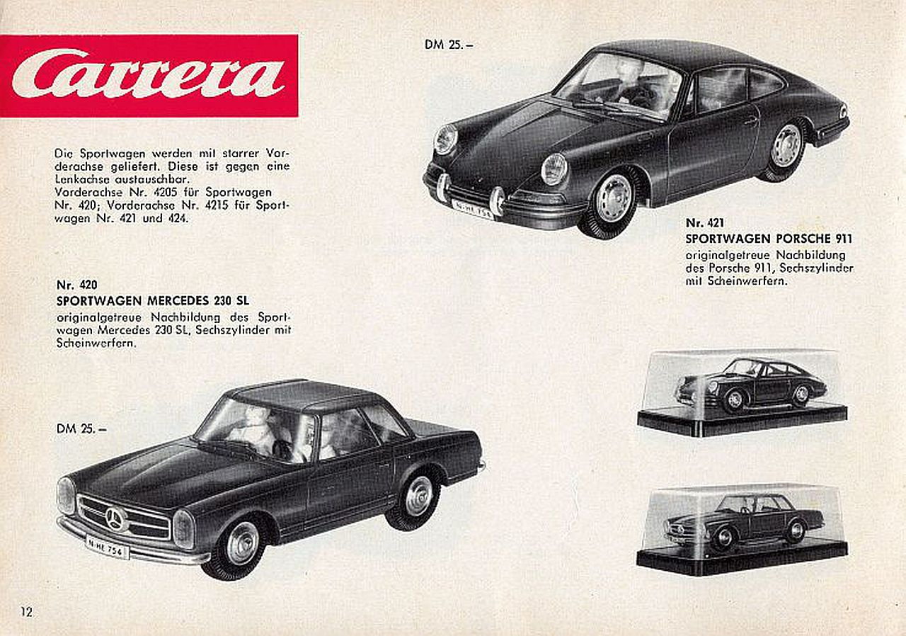 Markenliebhaber erinnern sich vielleicht noch an ein rotes Modell mit Hardtop, das bei der Wettfahrt Spa-Sofia-Lüttich gestartet ist. Aber im Gegensatz zum Porsche 911, der ausgerechnet auch noch im benachbarten Stadtteil „erfunden“ und obendrein mit luftgekühltem Heckmotor in das Rennen um die Gunst des Kunden geschickt wurde, sollte sich die Pagode im Motorsport nicht durchsetzen. Das hielt aber weder Carrera noch Scalextric oder Stabo Car und Faller davon ab, dieses schöne Modell in mehreren Varianten zu produzieren und auch Grundpackungen damit zu bestücken.