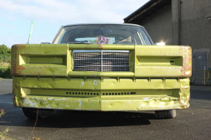 Wer diesen Mercedes-Benz 450 SE Baujahr 1978 zum ersten Mal erblickt, reibt sich ungläubig die Augen: Ein citrusgrün-metallic farbenes Ungetüm, dessen Front von grob angeschweißten Leitplanken geformt wird. Nicht elegant, nicht repräsentativ, sondern kompromisslos crash- und kampfbereit. Dieser Benz sieht nicht nur auf den ersten Blick außergewöhnlich aus, sondern auf jeden weiteren auch. Und das hat einen besonderen Grund.