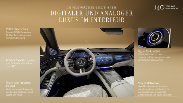 Das Infotainment der S-Klasse wird durch die MBUX Zero Layer-Technologie und neue Bedienkonzepte noch benutzerfreundlicher. Der Zero Layer auf dem Zentraldisplay zeigt die wichtigsten Informationen klar und übersichtlich an. Personalisierte Ambient-Stile und hochauflösende Animationen schaffen eine individuelle Atmosphäre im Fahrzeug. Das Navigationssystem MBUX Surround Navigation sorgt mit 3D-Grafiken für eine intuitive und präzise Übersicht, die den Fahrer in Echtzeit über die Umgebung informiert.