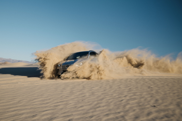 Die Vorteile, die Luftfederung und Hinterachslenkung mit einem Einschlagwinkel von bis zu 4,5 Grad im Alltag mit sich bringen, verpuffen hier im kalifornischen Wüstensand nahezu komplett. Das Zusammenspiel von E-Motoren, Bremseingriffen und Kraftverteilung verschiebt die Grenzen der Fahrdynamik eindrucksvoll ohne dass ein Verbrenner aufheult oder man sich Sorgen um Kühlung von Achsen und Motor machen muss. So düst der elektrische GLC im seitlichen Drift den nächsten Sandberg hinauf und auf der Schattenseite wieder herunter. Kein Wunder, dass an besonders beliebten Wochenenden aus dem San Bernadino Valley oder Las Vegas tausende von Wüstenfans an den Dumont-Spielplatz kommen.